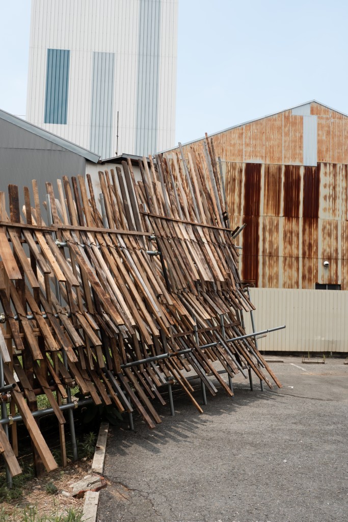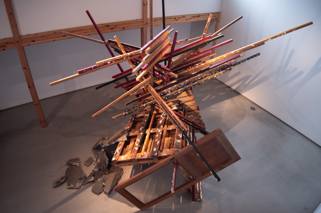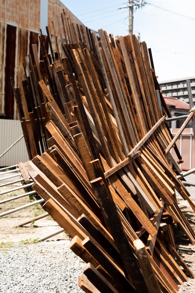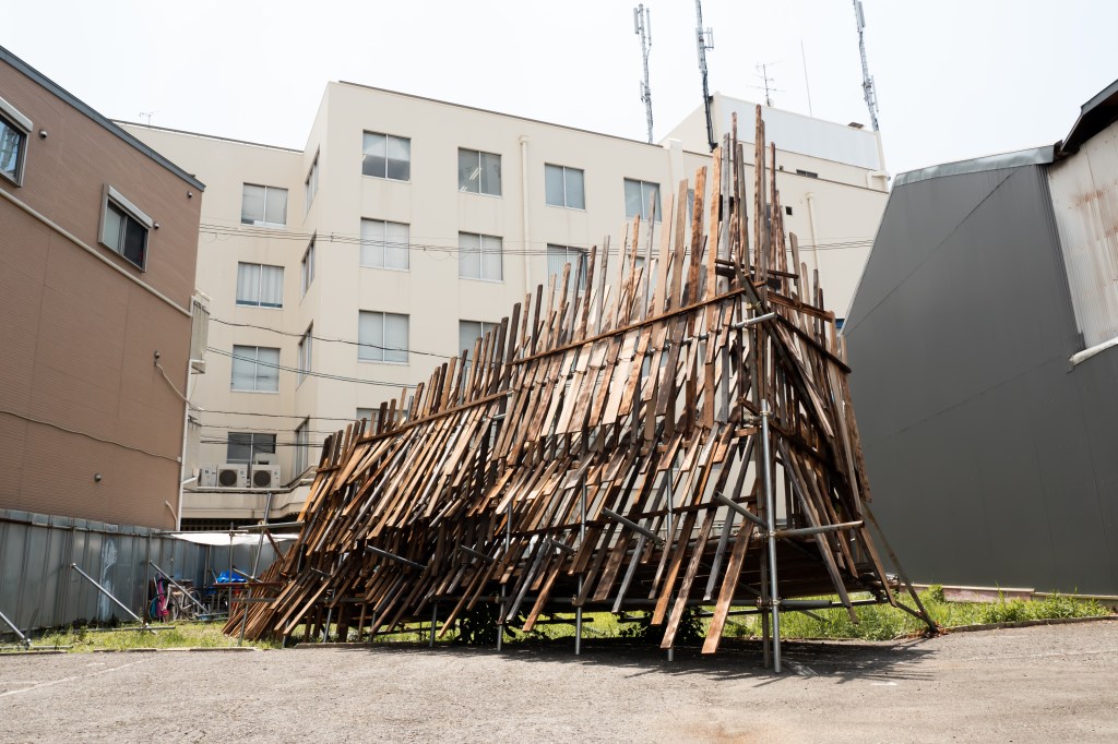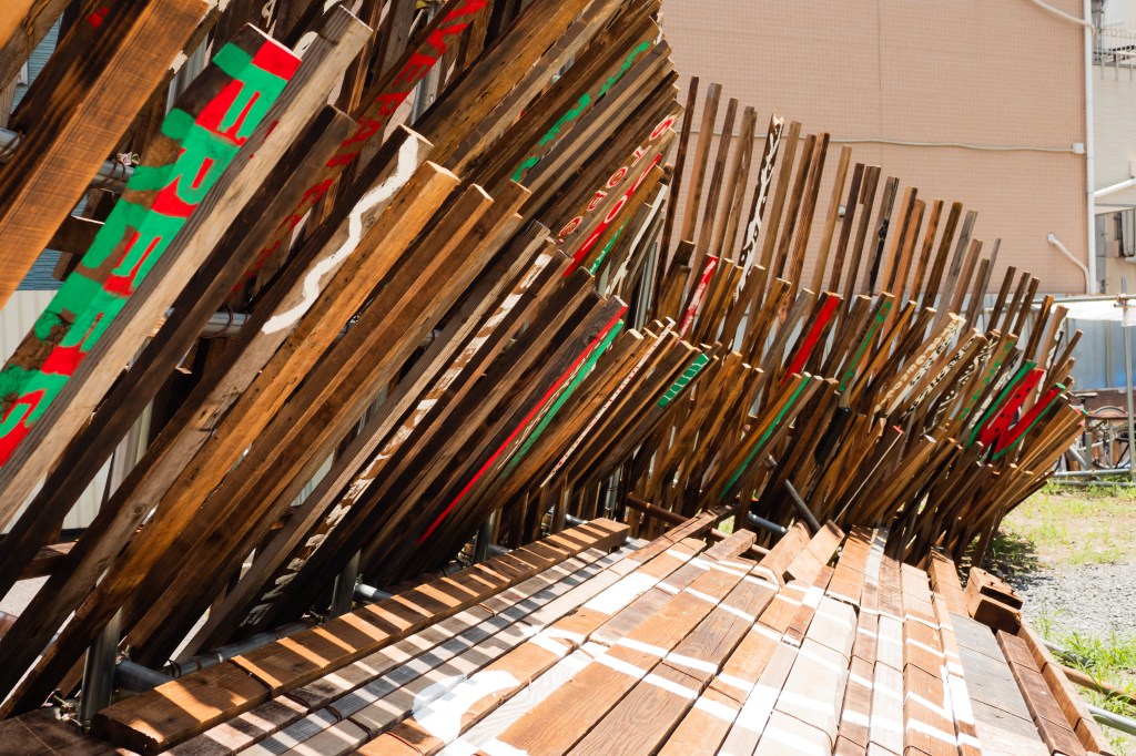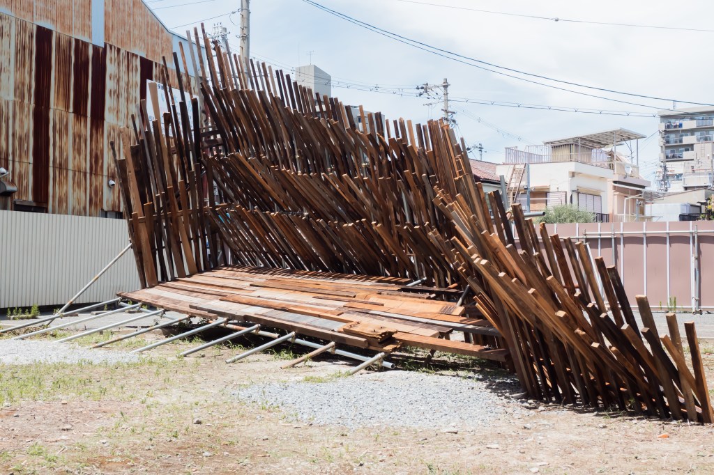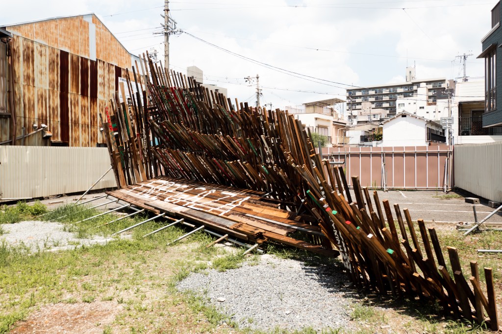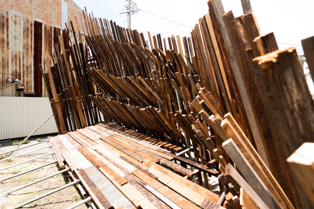 空き家と化した民家を解体・改修することで生まれる古材などの廃棄物はまちの衰退・再生=まちの変化に伴った産物とも言えます。人が作った物(ここでは空き家のことを指します)が半壊し、元の現状を留めていないモノ(古材)へと形状を変える。北加賀屋で暮らしていたひとびとの記憶が残った古材・廃棄物を再利用し作品として姿を変えることで、終わりのないモノの生涯=”物質の循環”を体現します。