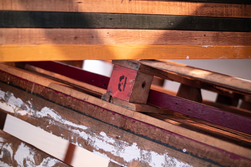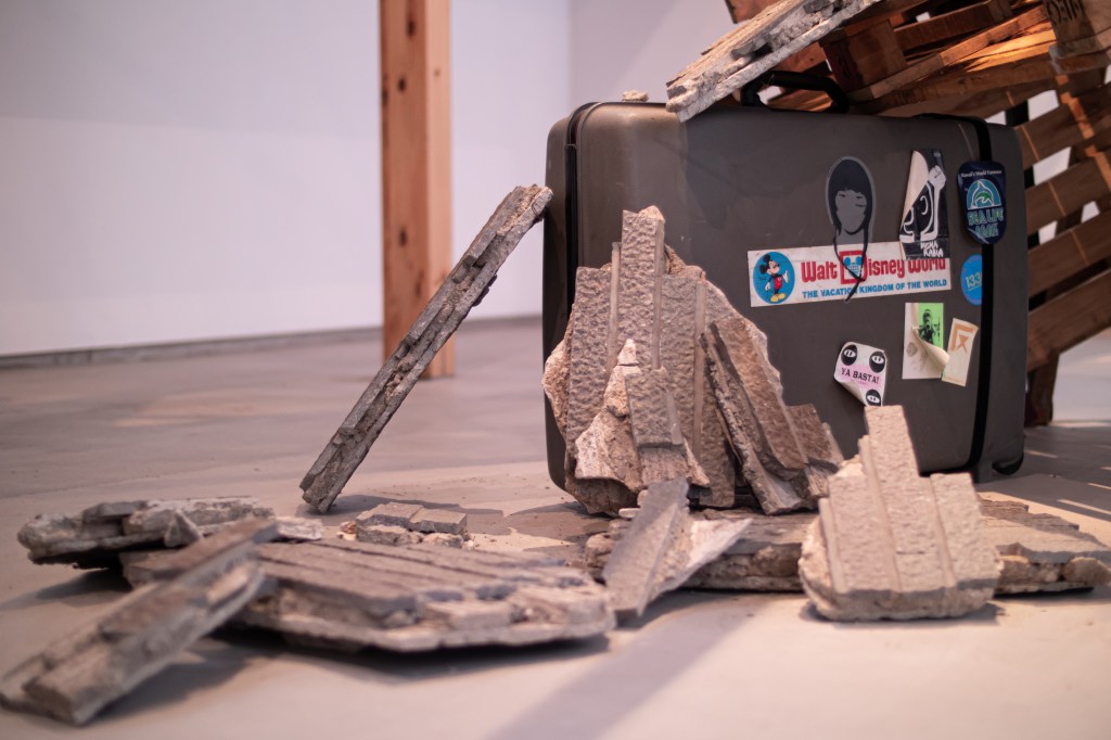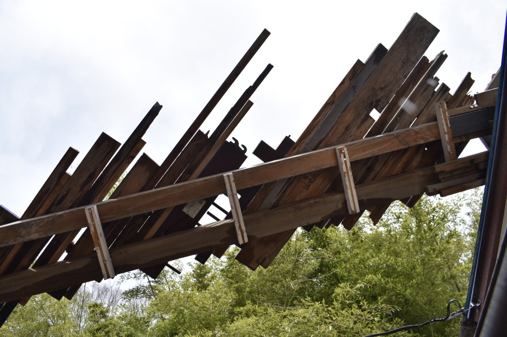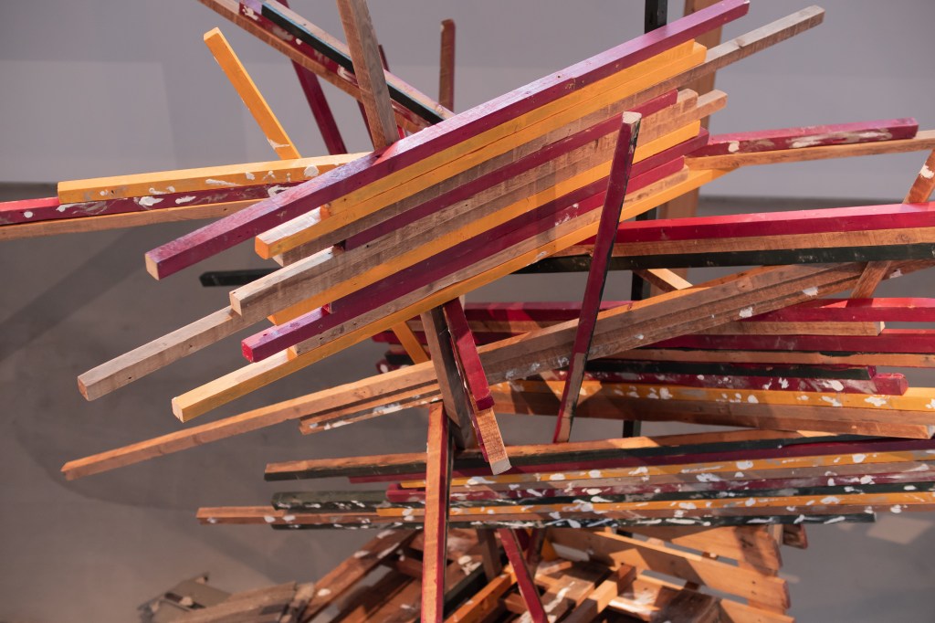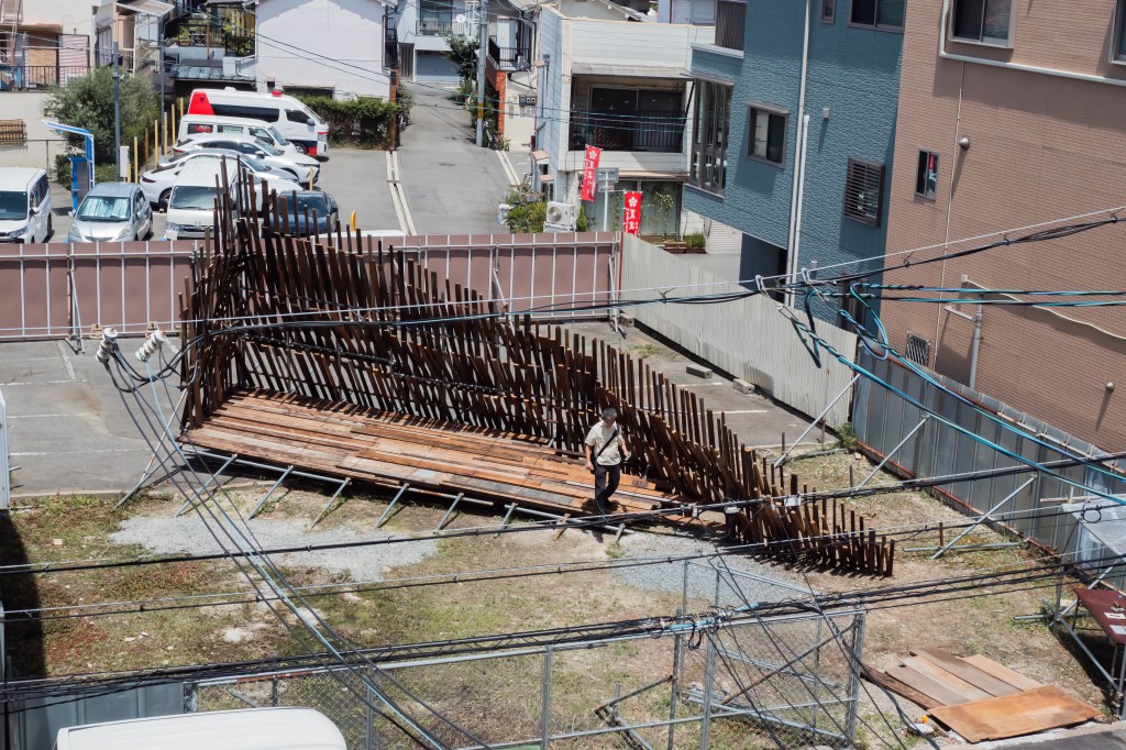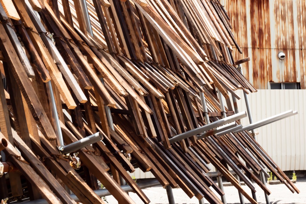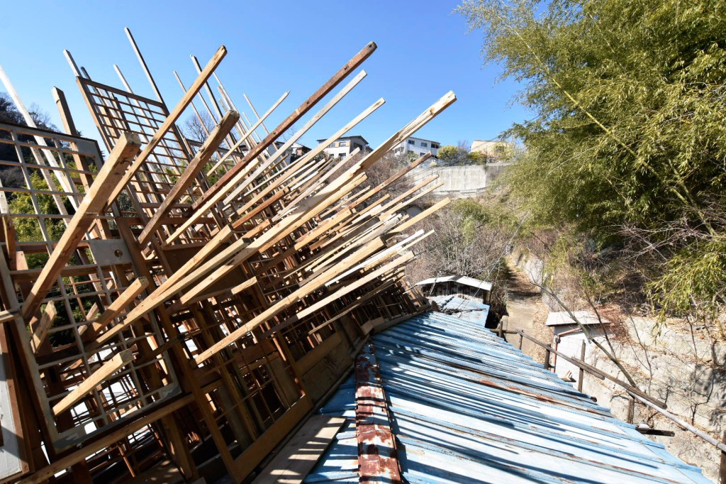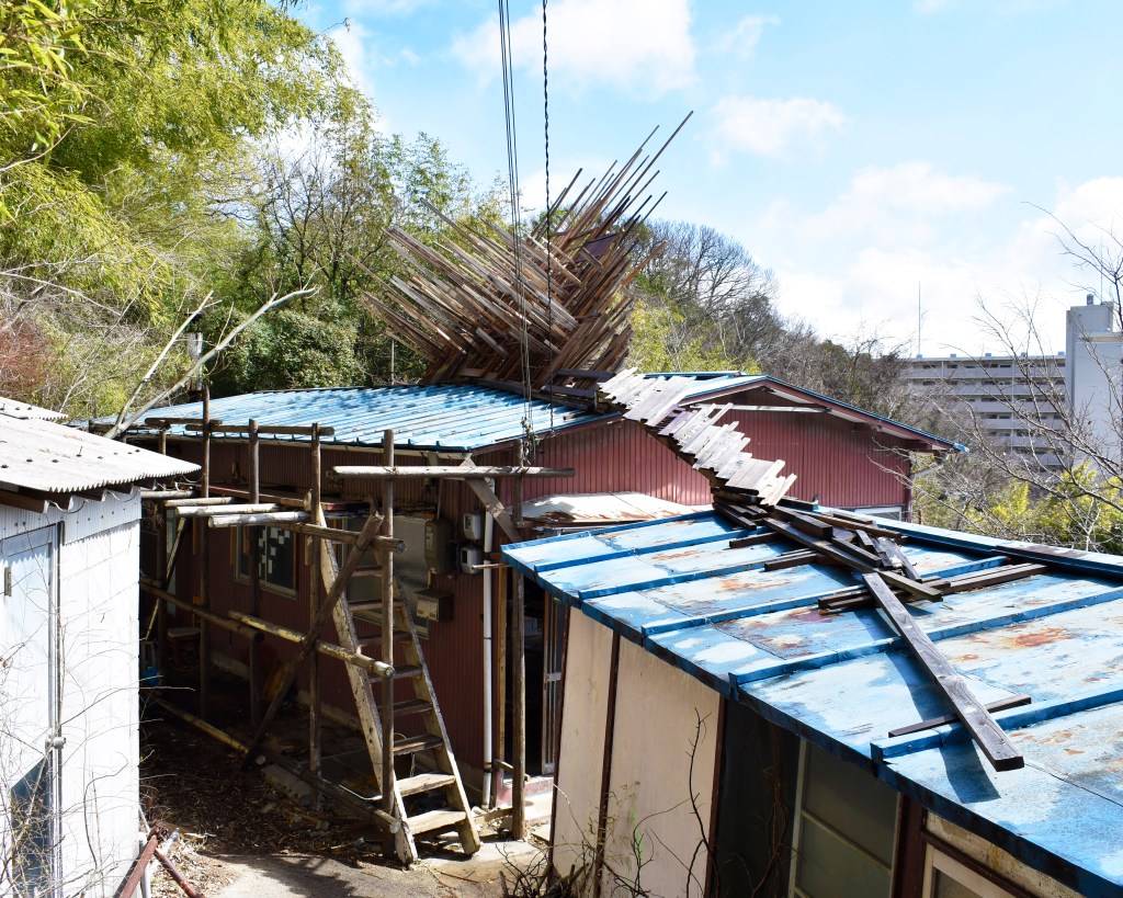 空き家と化した民家を解体・改修することで生まれる古材などの廃棄物はまちの衰退・再生=まちの変化に伴った産物とも言えます。人が作った物(ここでは空き家のことを指します)が半壊し、元の現状を留めていないモノ(古材)へと形状を変える。北加賀屋で暮らしていたひとびとの記憶が残った古材・廃棄物を再利用し作品として姿を変えることで、終わりのないモノの生涯=”物質の循環”を体現します。