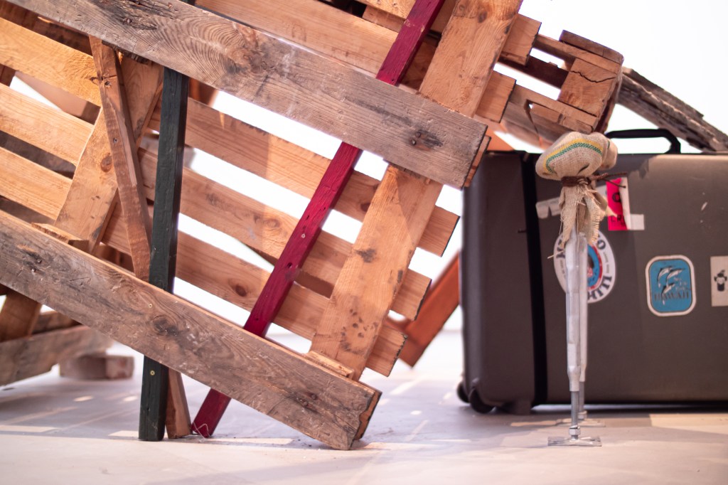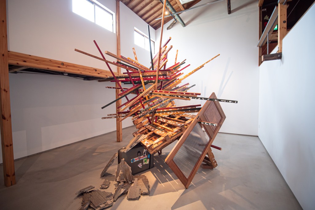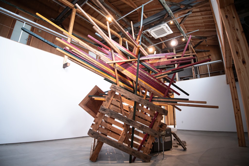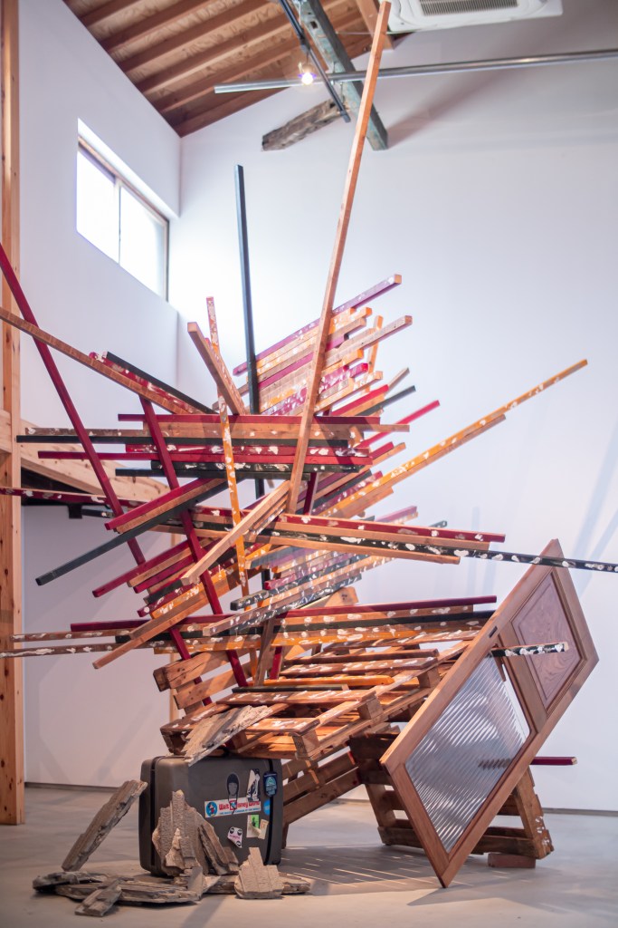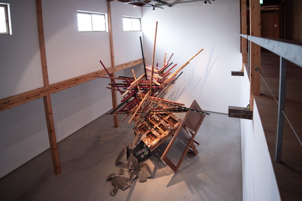 本作品と場所(千⿃⽂化)が共鳴し相互作⽤を⽣むことを⽬指し、設営期間5⽇を設け、この展⽰空間を創出しました。古材や廃棄物などの素材を組み合わせることで「物が持つ記憶」、「⼟地が持つ記憶」が過去から現在に繋がり、それが幾度にも重なる複雑な層になる事で、新たな関係性を結ぶ。そして、この場が⼈々の動きが⽣まれる交流地点となる。これを私の作品とします。