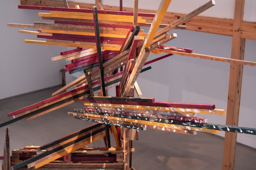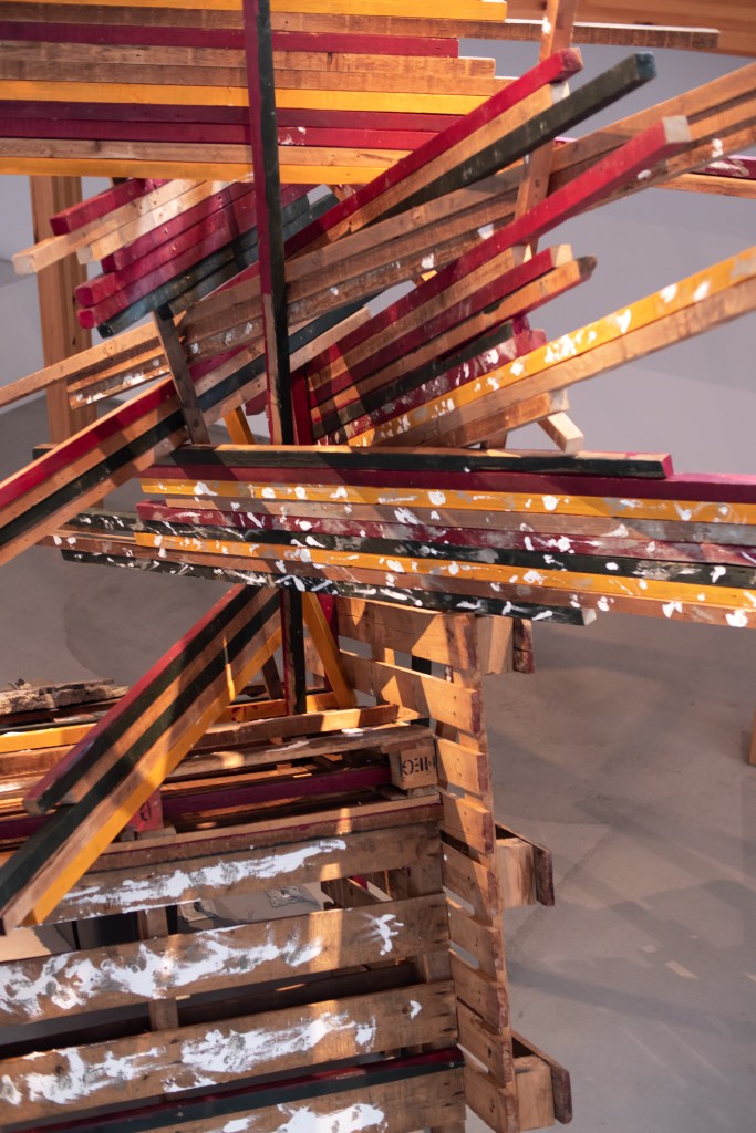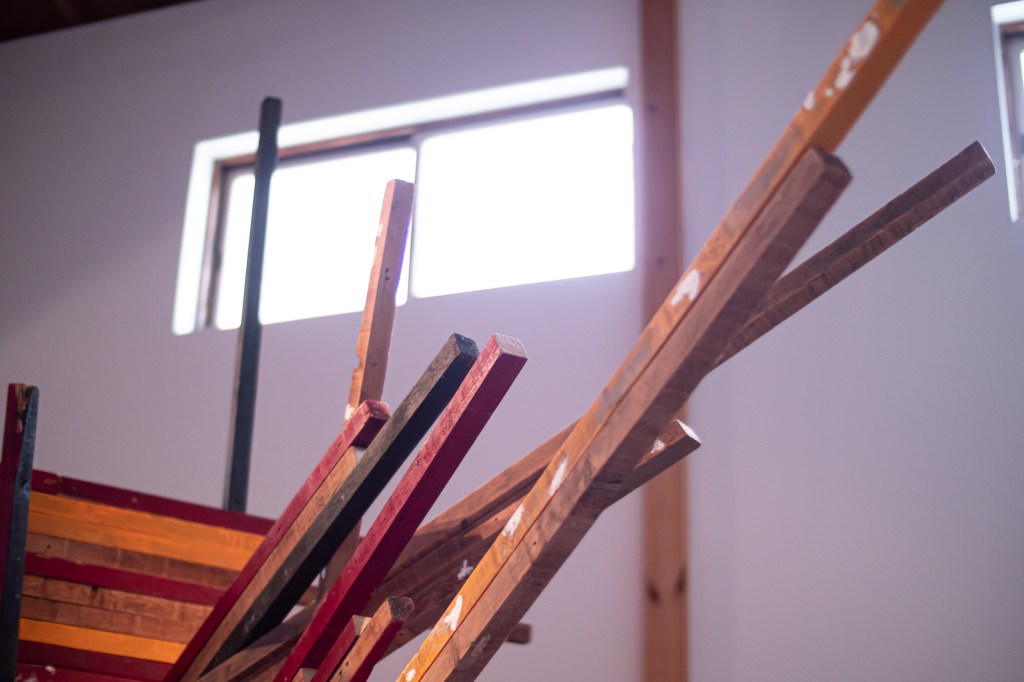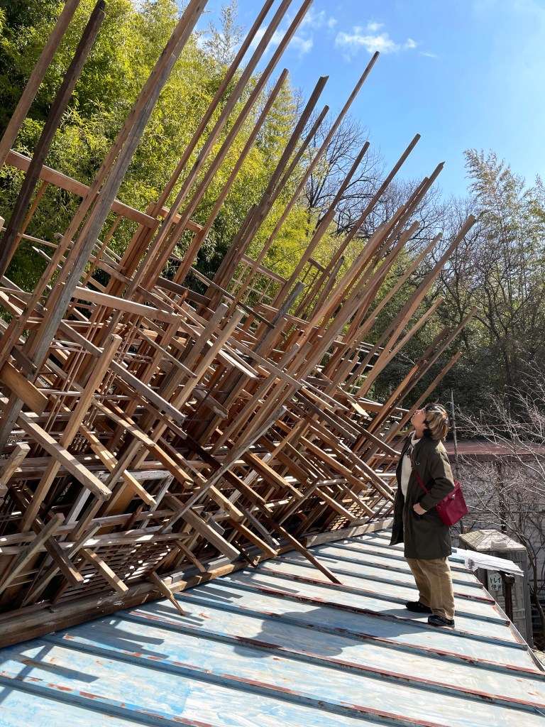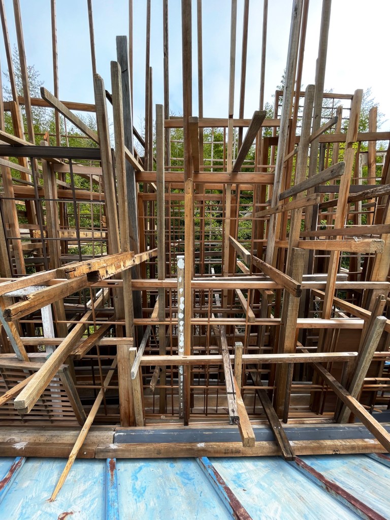 本作品と場所(千⿃⽂化)が共鳴し相互作⽤を⽣むことを⽬指し、設営期間5⽇を設け、この展⽰空間を創出しました。古材や廃棄物などの素材を組み合わせることで「物が持つ記憶」、「⼟地が持つ記憶」が過去から現在に繋がり、それが幾度にも重なる複雑な層になる事で、新たな関係性を結ぶ。そして、この場が⼈々の動きが⽣まれる交流地点となる。これを私の作品とします。