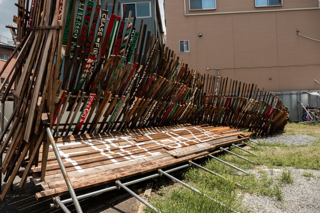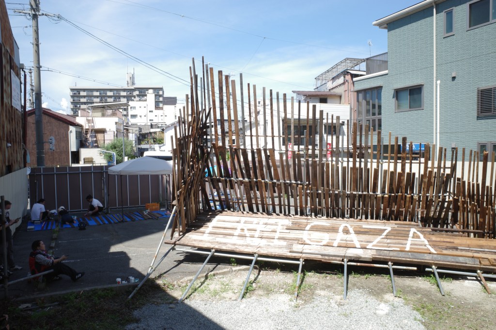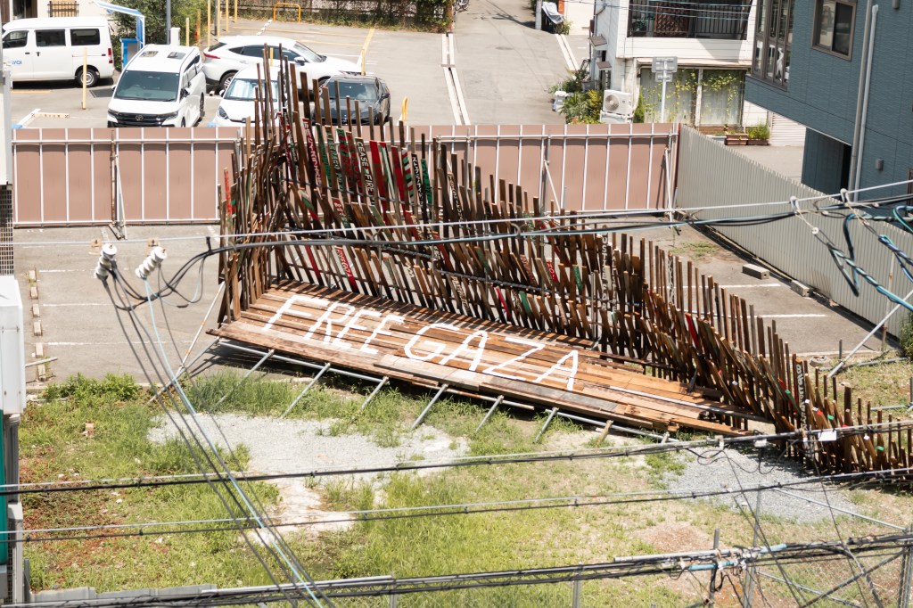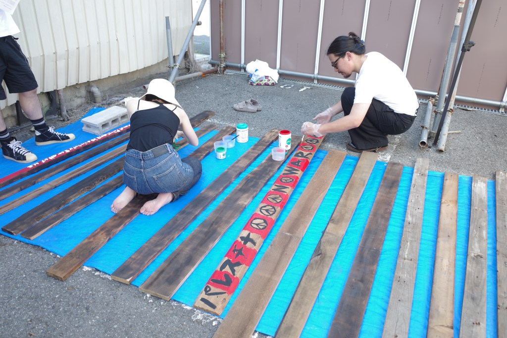 私は政治的な問題を起点に作品を作ることはあまりない。しかし、パレスチナで起こっていることは私のような作品をつくる上で土地(場所)と作品の関係を大切にしている人間にとって考えさせられる問題でした。パレスチナの土地が、人が、虐殺で奪われていく現実をメディアを通じて見ている私たち。この作品を構成する廃材、道路際の誰もが観れる空き地で展示することを通じて、外に向かって発信できる事があるのではと思いながら制作していました。そして今回、ブランドMAKE LOVE,NOT WARのデザイナーであるYUKAさん にイベントをしようとお声がけしたところ、参加者と共に想いを作品にペイントしてもらう体験型イベントの提案をしていただき実施しました。