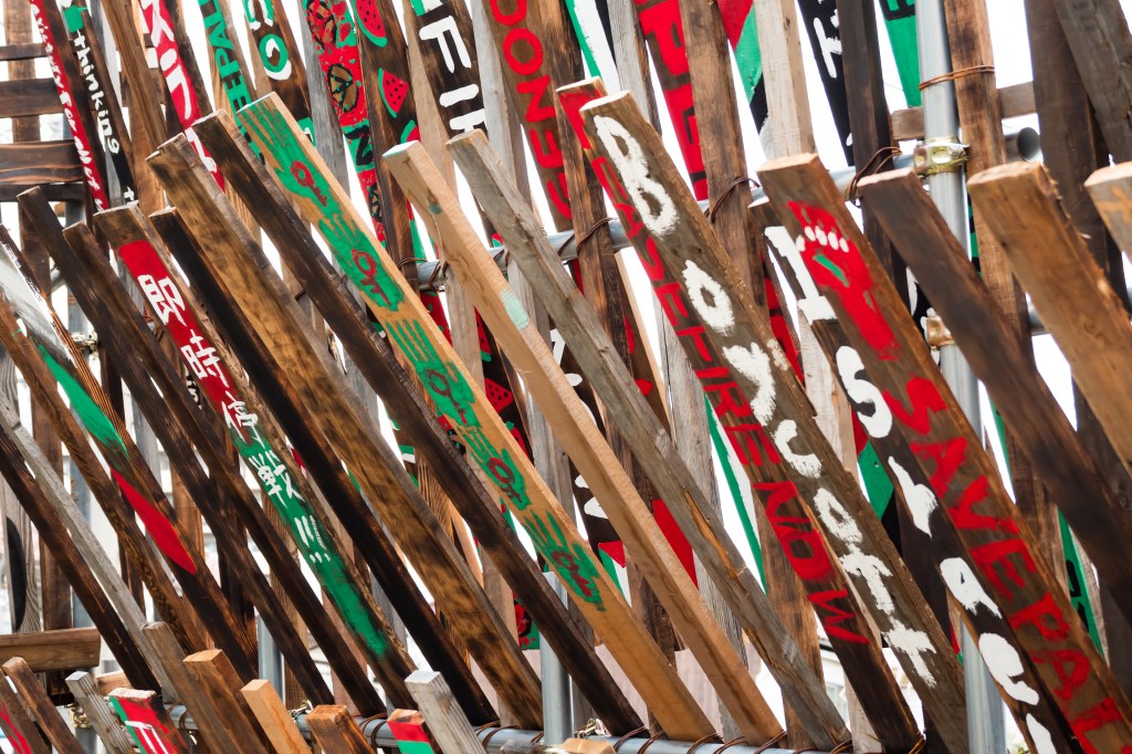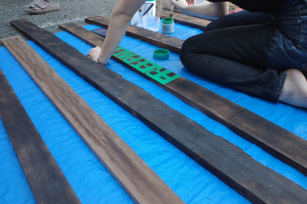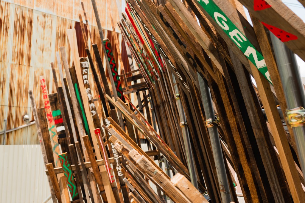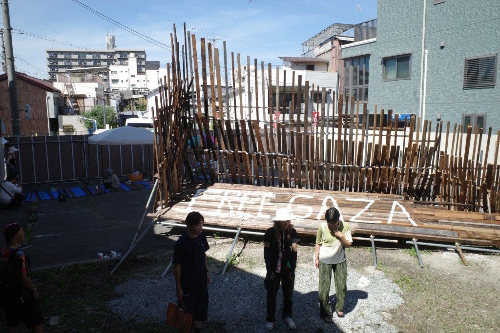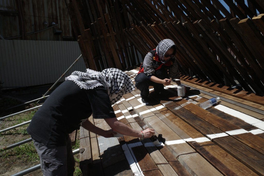私は政治的な問題を起点に作品を作ることはあまりない。しかし、パレスチナで起こっていることは私のような作品をつくる上で土地(場所)と作品の関係を大切にしている人間にとって考えさせられる問題でした。パレスチナの土地が、人が、虐殺で奪われていく現実をメディアを通じて見ている私たち。この作品を構成する廃材、道路際の誰もが観れる空き地で展示することを通じて、外に向かって発信できる事があるのではと思いながら制作していました。そして今回、ブランドMAKE LOVE,NOT WARのデザイナーであるYUKAさん にイベントをしようとお声がけしたところ、参加者と共に想いを作品にペイントしてもらう体験型イベントの提案をしていただき実施しました。