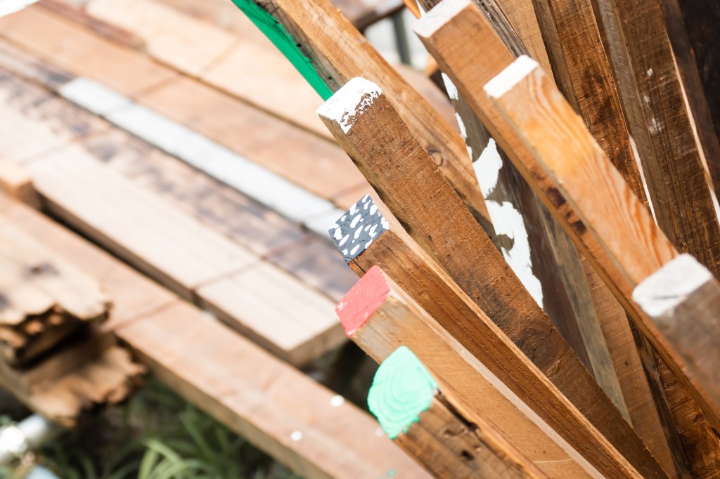 空き地に北加賀屋で収集した廃材を使い体験型作品を設置する。